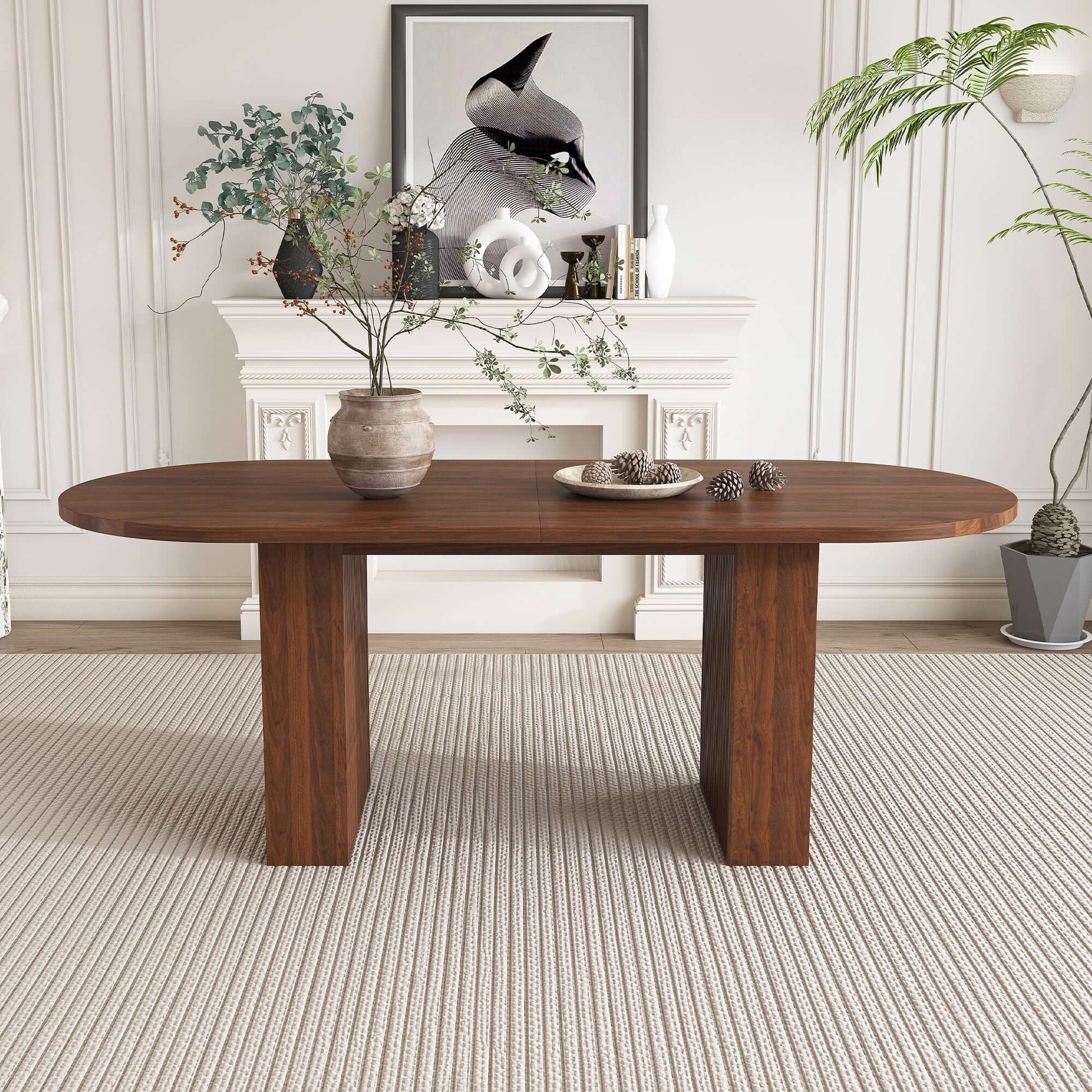 The 63-Inch Oval Walnut Dining Table combines modern farmhouse charm with durable everyday functionality. Featuring a smooth oval tabletop and a warm walnut woodgrain finish, this table creates an inviting centerpiece for kitchens, apartments, and dining spaces.