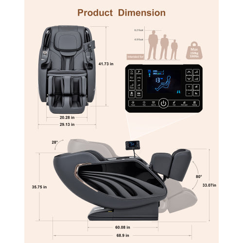 Functions: Zero Gravity (2 Levels), Airbag Massage, SL-Track, Back Heat, Foot Rollers, Adjustable Timer, LCD Touchscreen