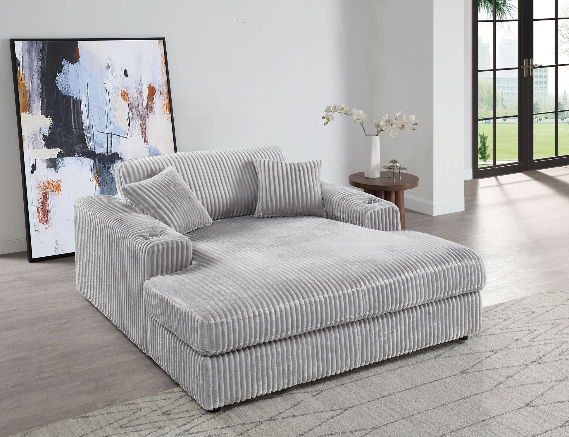 🩶 Oversized Gray Corduroy Deep Seat Chaise Lounge with Cup Holder & 2 Pillows – Modern Comfy Accent Chair